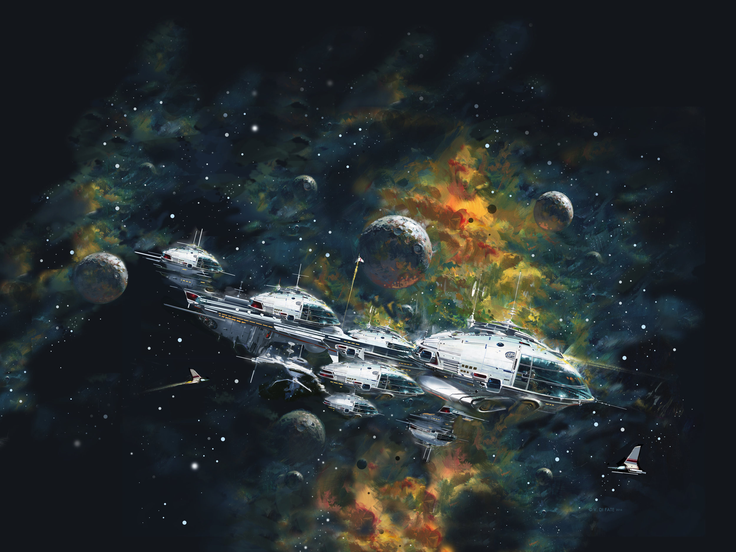 McCall’s space-faring optimism breathes through my interstellar tales, while McQuarrie’s cinematic scope influences the way I visualize key moments. Mead’s industrial and urban designs whisper through my futuristic cities, and Di Fate’s sense of scale reminds me to always think beyond the immediate, to dream larger.